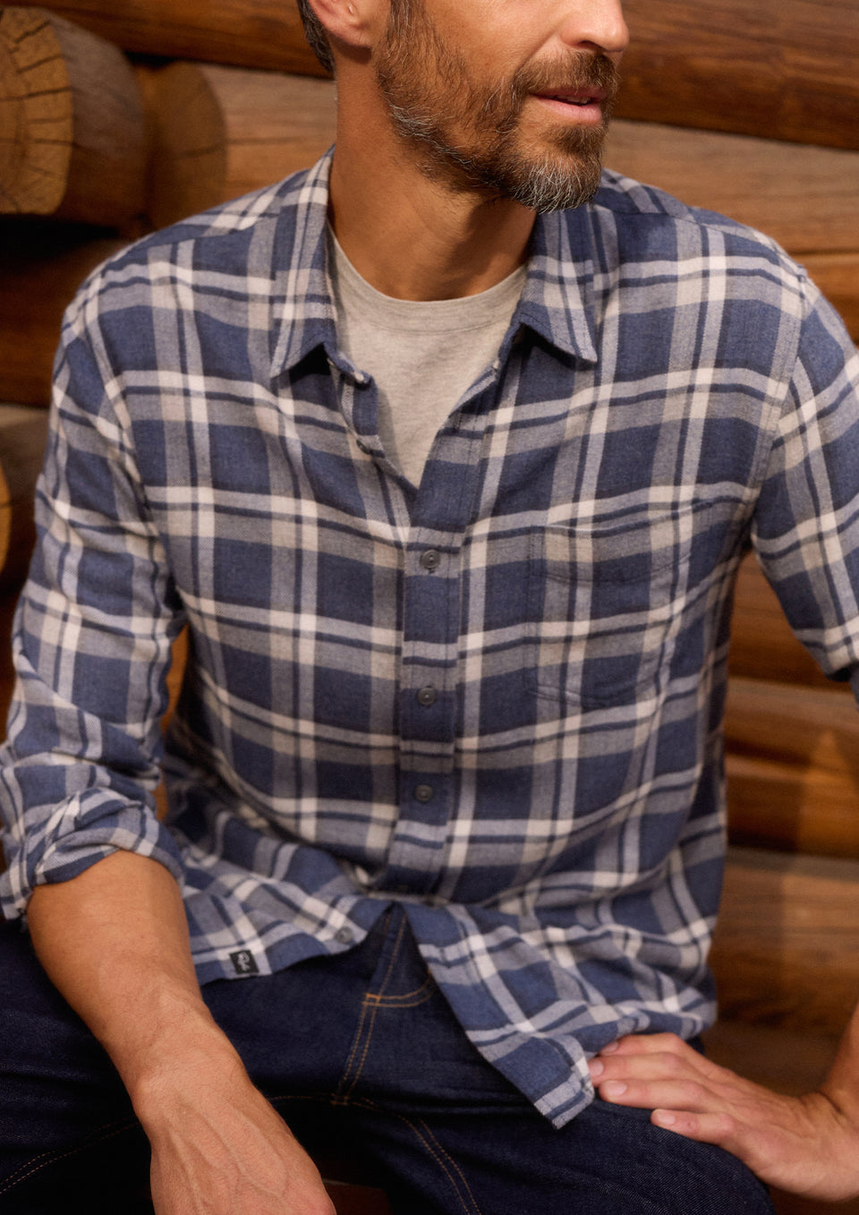 Malin Cropped Long-Sleeve Button Up with a Chest Patch Pocket in Midnight Blue White Colorway, plaid - Front View Featured on Model