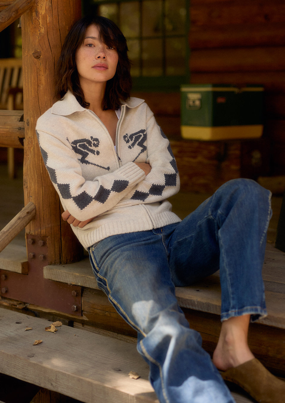 Rhea, a longline cardigan in a wool blend with skier motifs in Powder Grey Colorway. The cardigan has a relaxed fit and zip-front closure. Front View Featured on Model, Unzipped