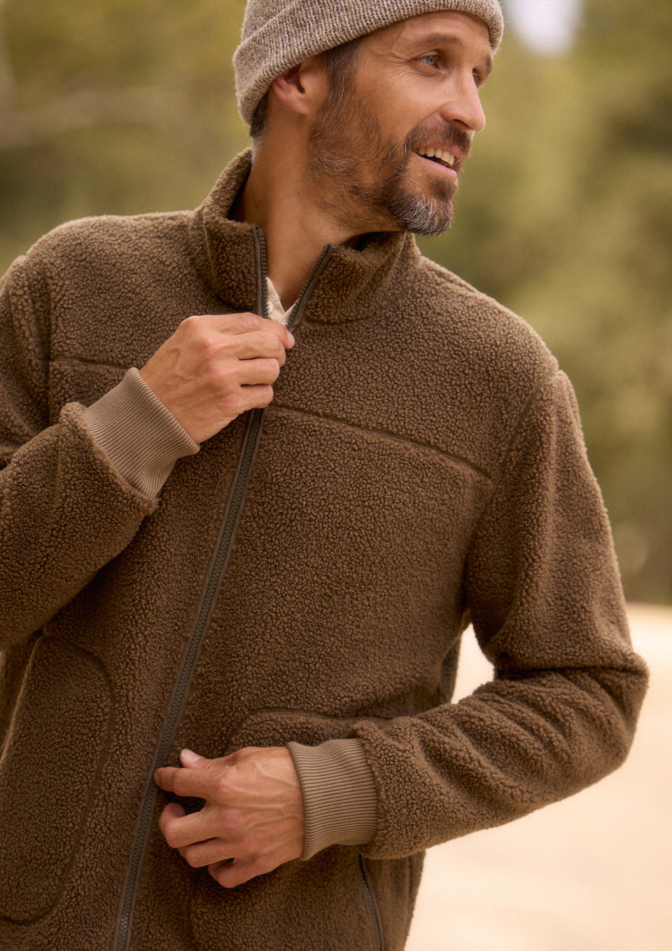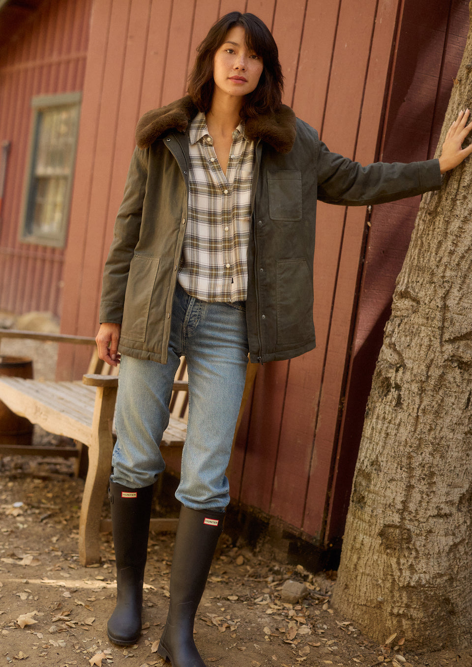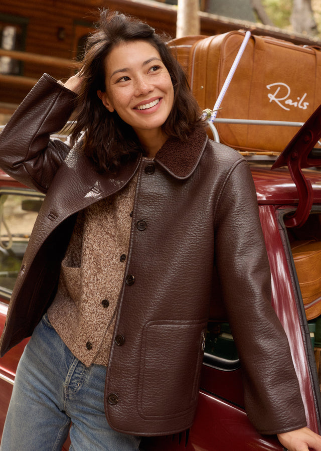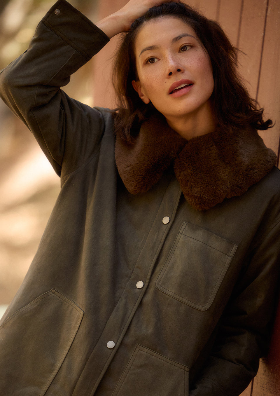 An umber waxed cotton canvas jacket with a removable vegan-fur collar. The jacket has a zip front with snap closures, quilted lining, chest patch pocket, and side pockets for a functional, workwear-inspired look. Front View Featured on Model.