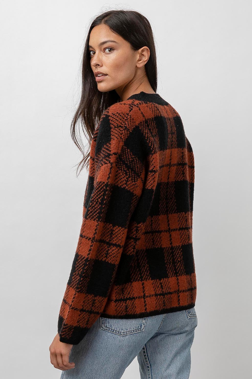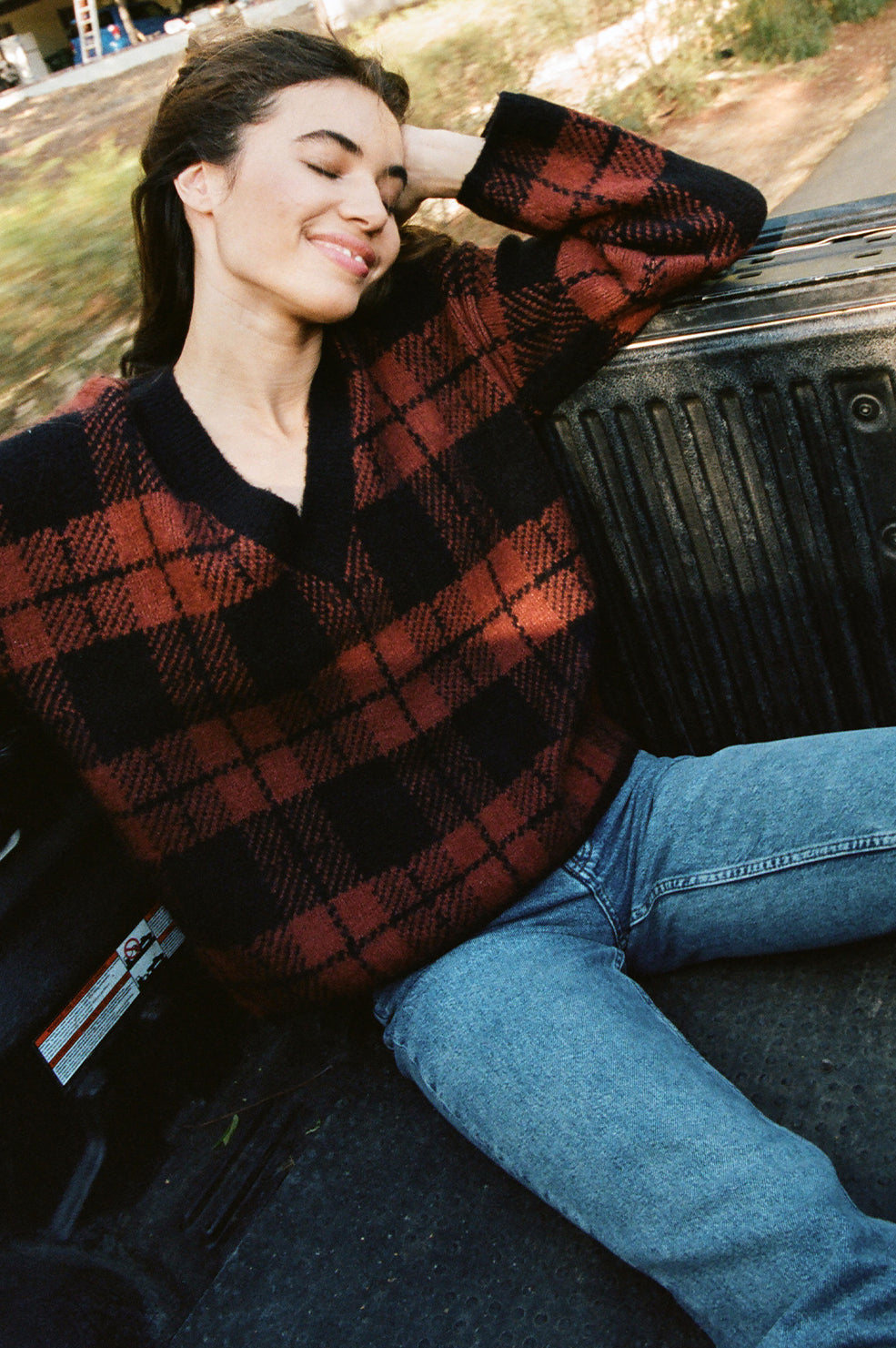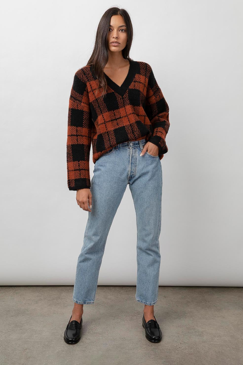 Medium weight, wool blend, rust orange oversized v-neck sweater featuring a black plaid jacquard design, relaxed fit, dropped shoulder, and ribbed trim at neckline and cuffs. This cozy sweater with its classic design can be dressed up or down and is perfect for cooler weather.
