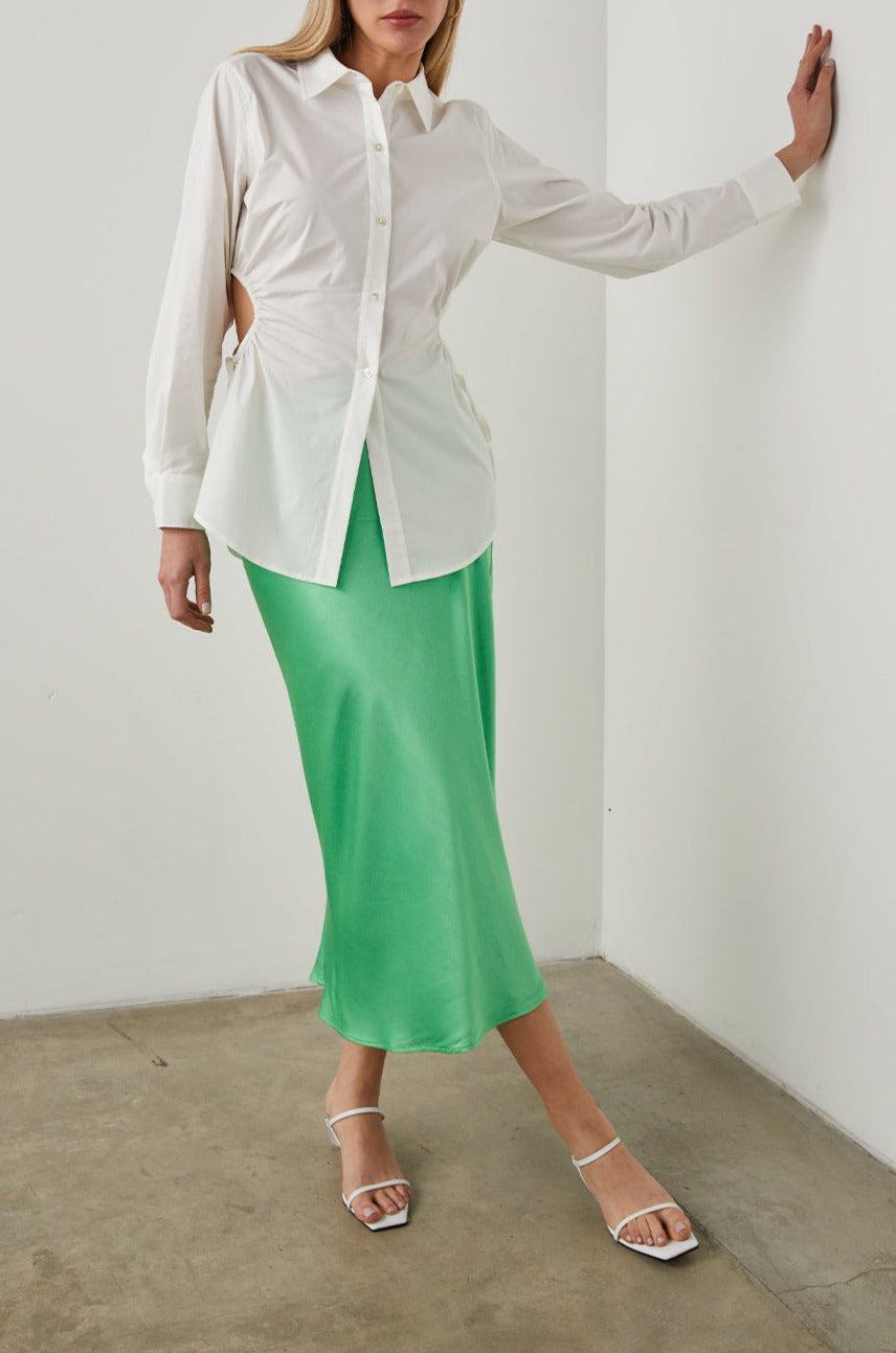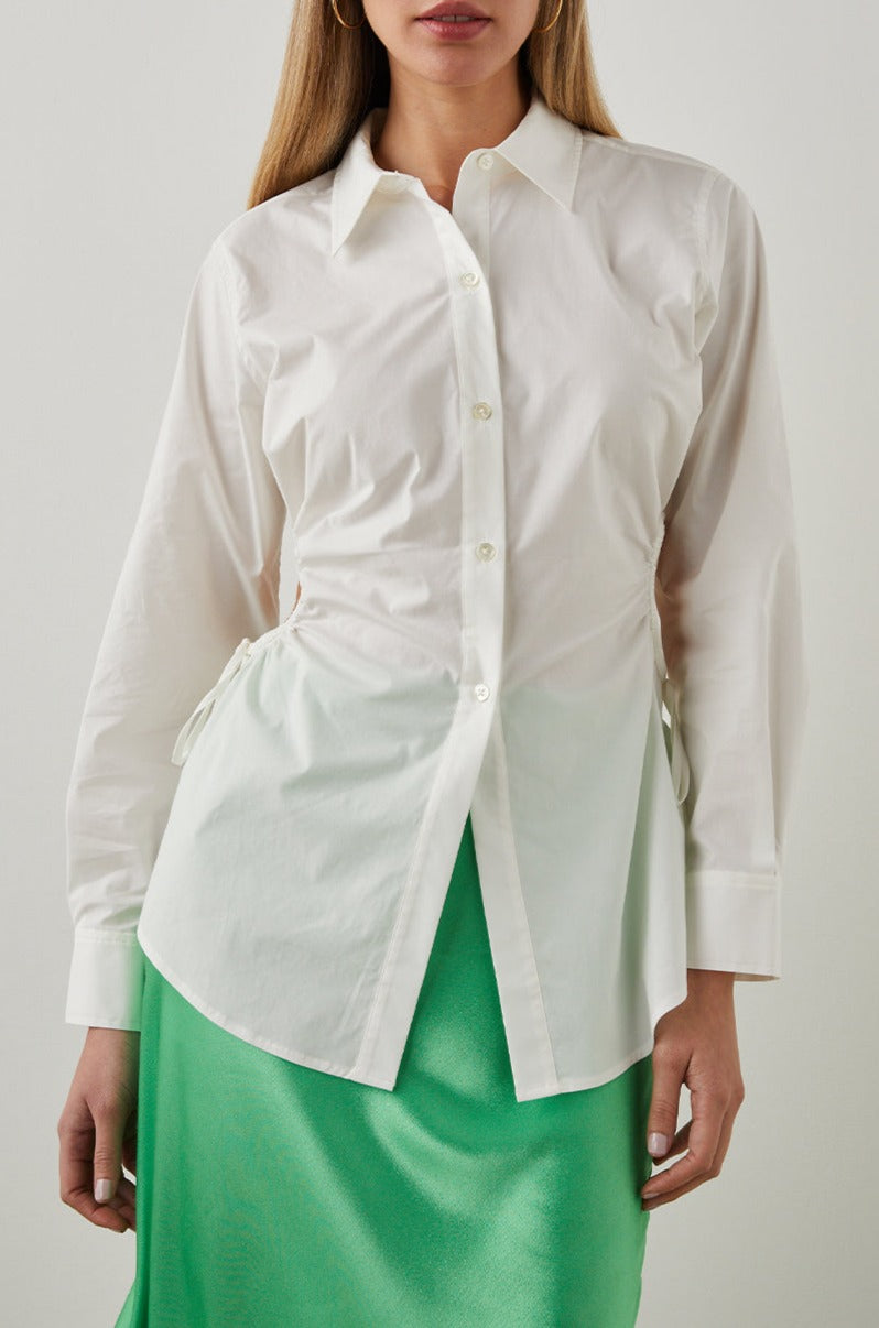 Le haut Cristiana propose une interprétation nouvelle d'un héros incontesté de la garde-robe : la chemise boutonnée classique. Cette chemise ajustée est confectionnée en popeline de coton impeccable. Les découpes circulaires de chaque côté sont entièrement réglables. Suggestion : portez les boutons du bas ouverts avec un jean taille haute.