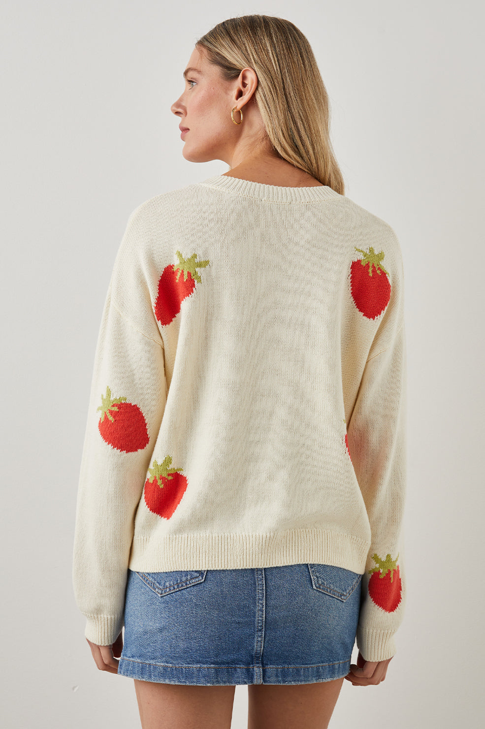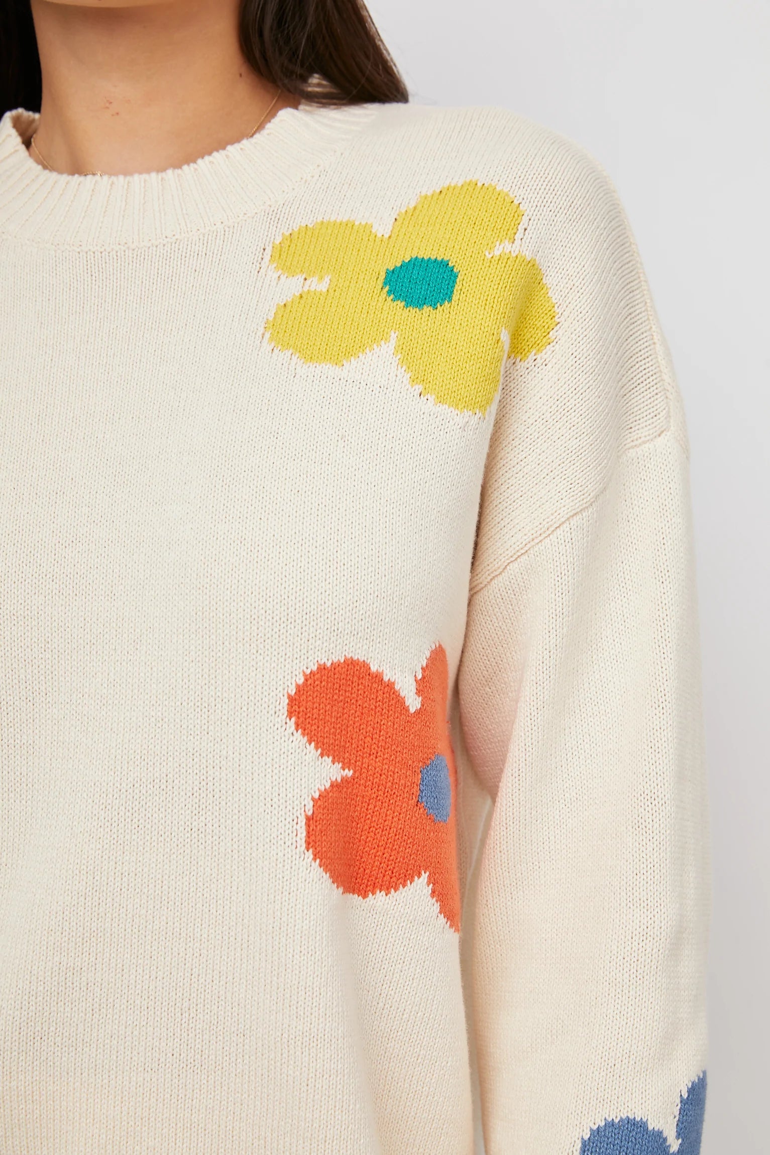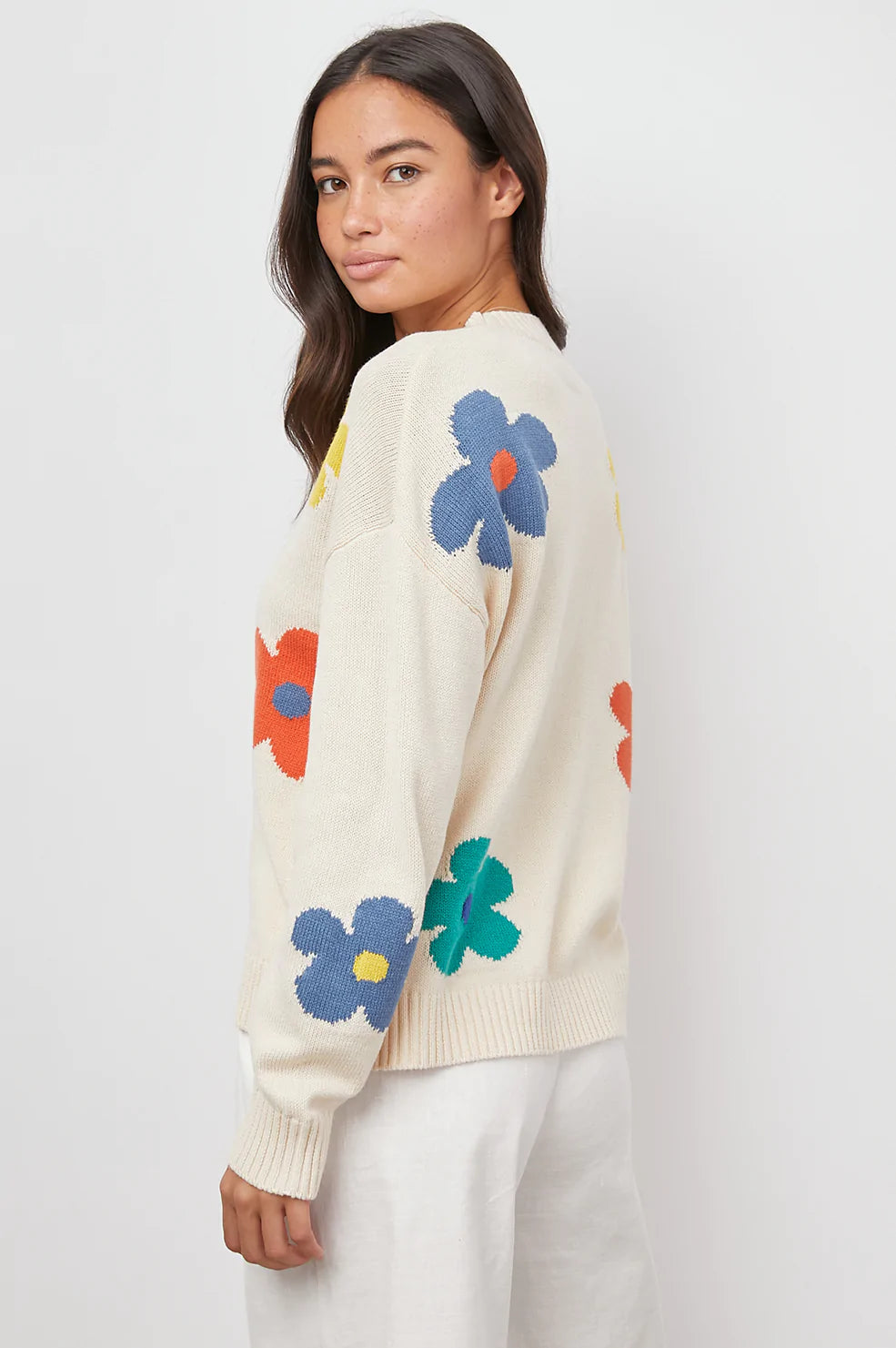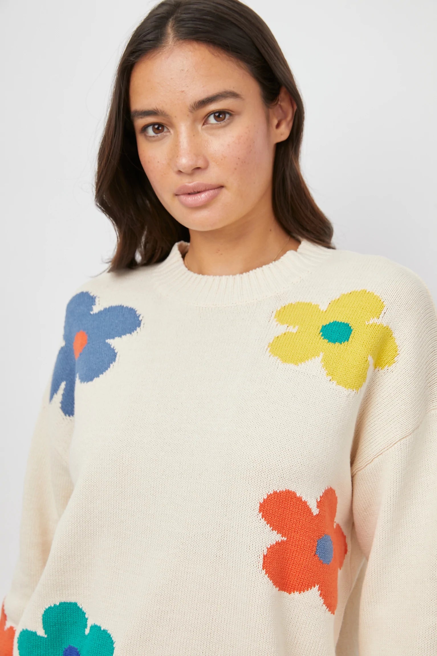The Perci Sweater is an easy knit made of a wool blend. It's detailed with gold stars against an olive base and features include a dropped shoulder, relaxed fit, and thick ribbed trim at the cuffs and hem.